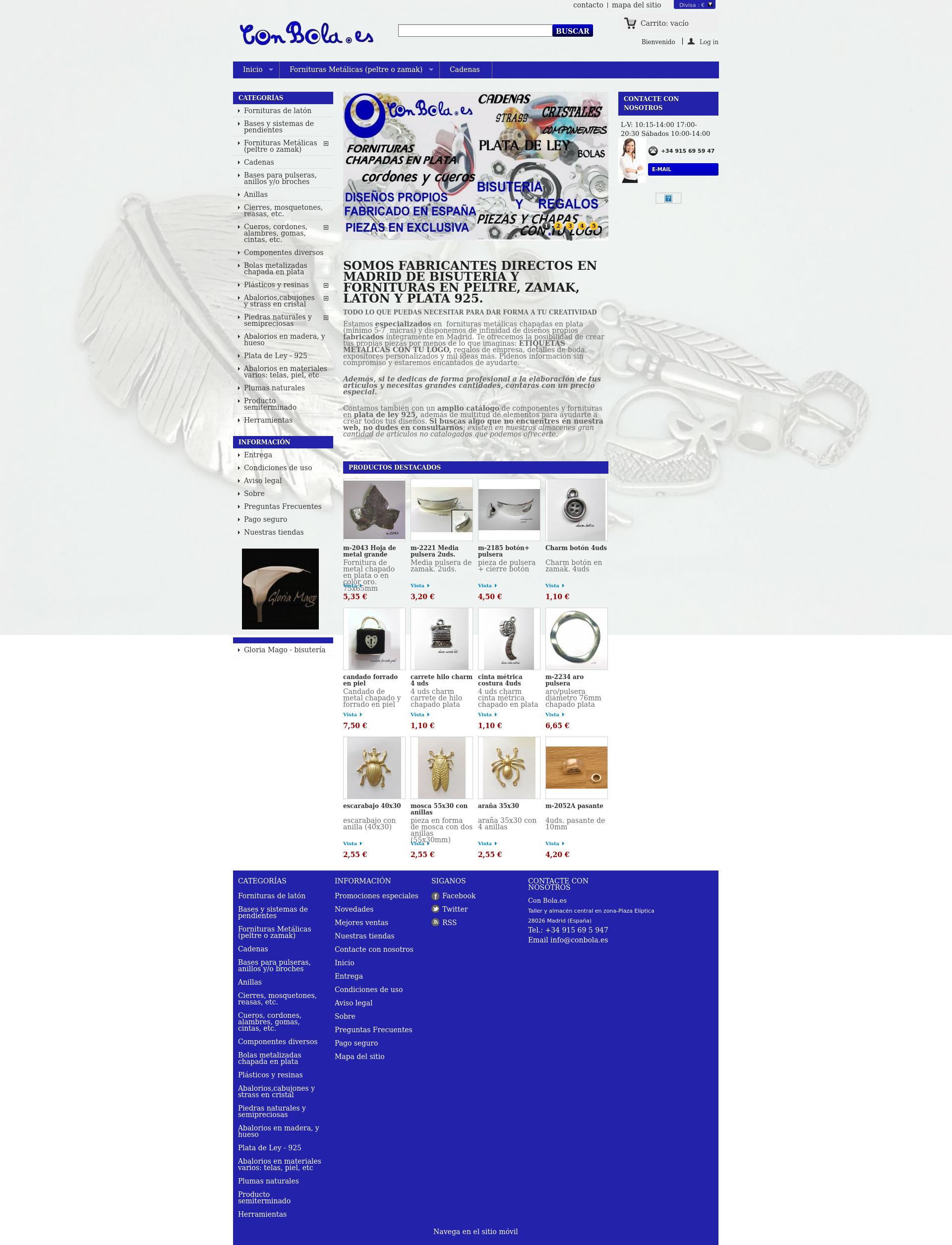 Estamos especializados en fornituras metálicas chapadas en plata (mínimo 5-7 micras) y disponemos de infinidad de diseños propios fabricados íntegramente en Madrid. Te ofrecemos la posibilidad de crear tus propias piezas por menos de lo que imaginas: ETIQUETAS METÁLICAS CON TU LOGO, regalos de empresa, detalles de boda, expositores personalizados y mil ideas más. Pídenos información sin compromiso y estaremos encantados de ayudarte.