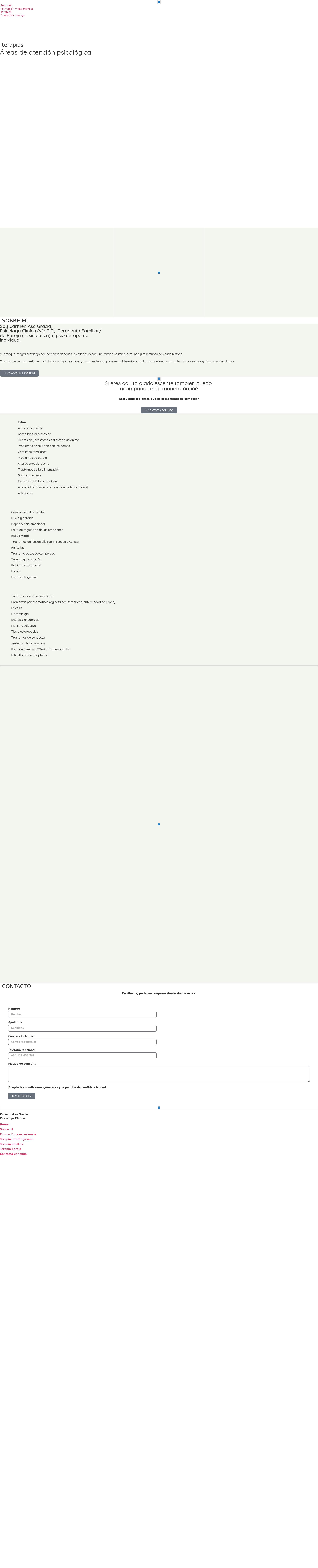 Carmen Aso Gracia es una psicóloga clínica especializada en terapia infanto-juvenil y para adultos. Ofrecemos un enfoque terapéutico integral, proporcionando atención personalizada a niños, adolescentes y adultos que necesiten apoyo emocional o psicológico. Nos especializamos en tratar trastornos como ansiedad, depresión, estrés, fobias, conflictos familiares y problemas de relación, aplicando terapias adaptadas a las necesidades de cada paciente, como la terapia cognitivo-conductual y la terapia sistémica familiar.