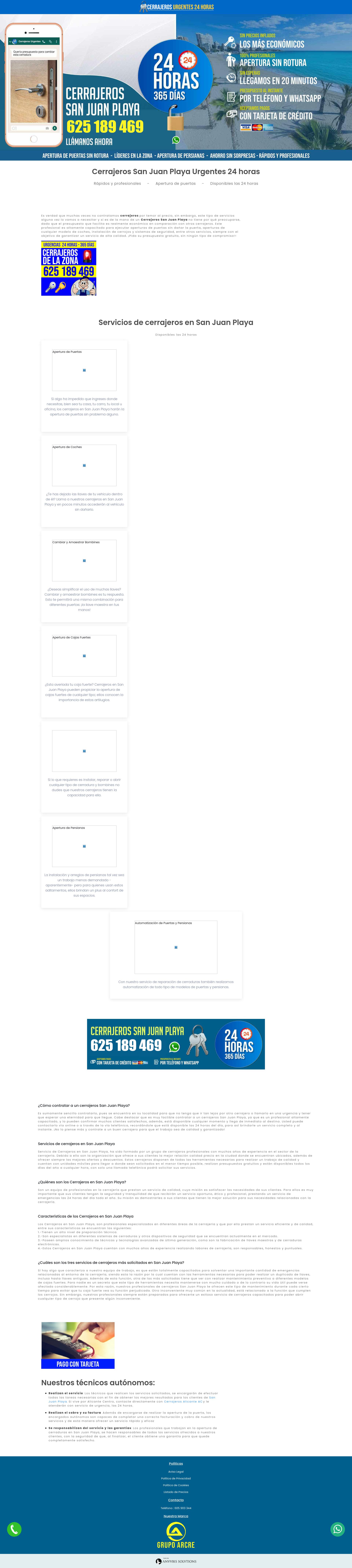 En Cerrajeros San Juan Playa somos especialistas en proteger lo que más te importa. Ofrecemos un servicio integral de cerrajería profesional, combinando rapidez y eficacia. Ya sea para una apertura urgente, un cambio de cerradura o mejorar la seguridad de tu hogar o negocio, nuestro equipo está listo para ayudarte. Nos enorgullece ofrecer un trato cercano, precios transparentes y soluciones inmediatas en toda la zona de San Juan Playa. ¡Tu tranquilidad es nuestra prioridad!