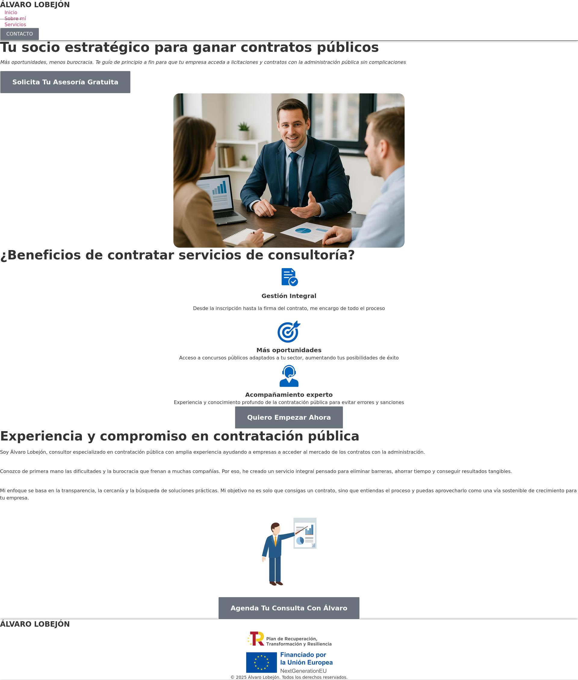 Álvaro Lobejón es consultor independiente especializado en contratación pública. Acompaña a empresas de todos los sectores en la identificación y gestión de oportunidades con la administración, facilitando su acceso a licitaciones y concursos públicos. Su enfoque práctico y personalizado permite a sus clientes optimizar procesos, cumplir con los requisitos legales y aumentar sus opciones de adjudicación sin desviar recursos internos.