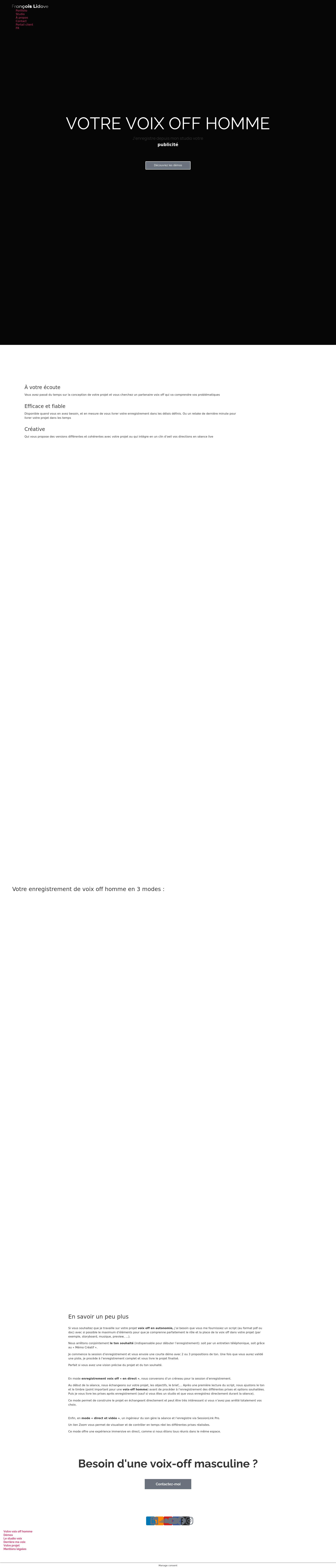 Vous cherchez une voix off professionnelle pour donner de l’impact à votre message ? Avec une interprétation précise et une large palette vocale, François Lidove s’adapte à tous vos projets : publicités (TV & web), vidéos d’entreprise, e-learning, audioguides, audiobooks et annonces en megaphonie. Son expertise garantit une communication claire, engageante et parfaitement adaptée à votre audience. Il propose également des voix off pour jeux vidéo et personnages, apportant profondeur et réalisme à vos créations interactives. Faites confiance à un professionnel qui donne une véritable identité sonore à vos projets.