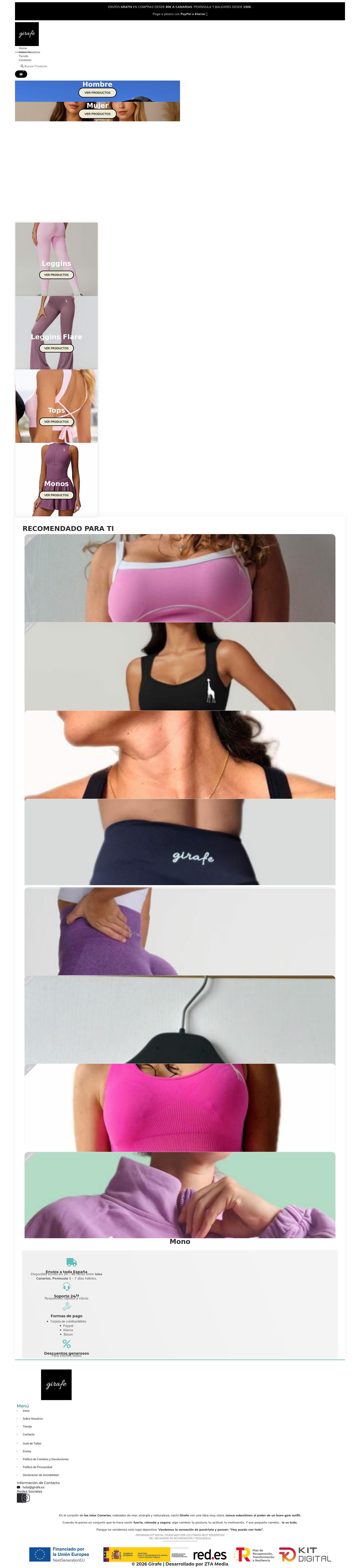 Girafe es una tienda de ropa deportiva nacida en Canarias que ofrece prendas para hombre y mujer, como leggings, tops, monos y accesorios, con diseños pensados para potenciar estilo y comodidad.