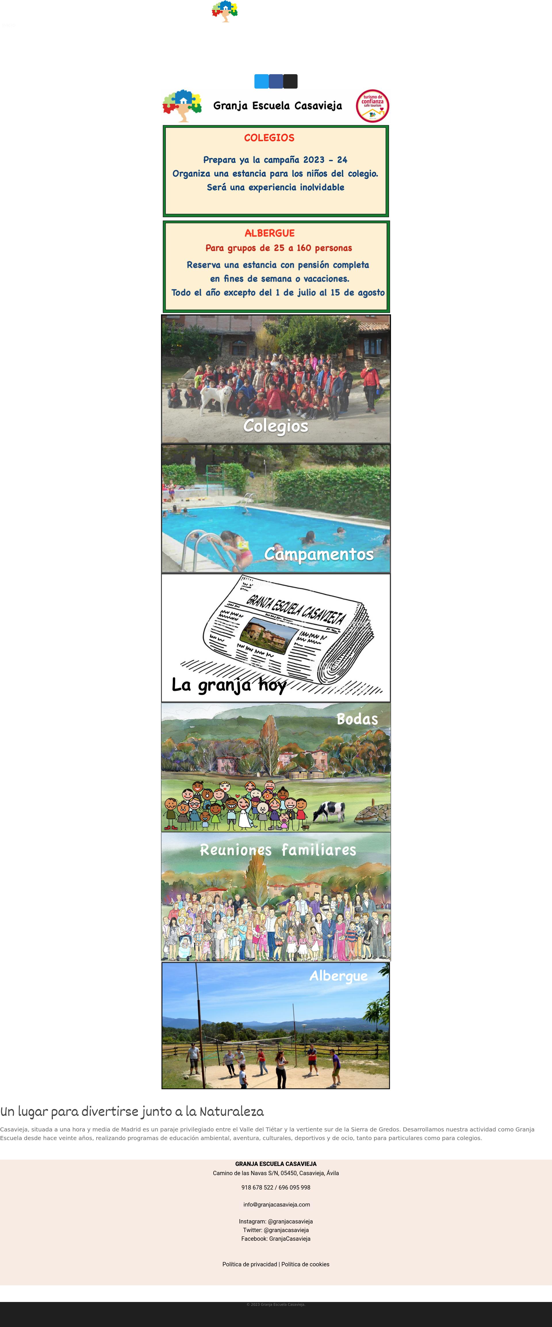 Casavieja, situada a una hora y media de Madrid es un paraje privilegiado entre el Valle del Tiétar y la vertiente sur de la Sierra de Gredos. Desarrollamos nuestra actividad como Granja Escuela desde hace veinte años, realizando programas de educación ambiental, aventura, culturales, deportivos y de ocio, tanto para particulares como para colegios.