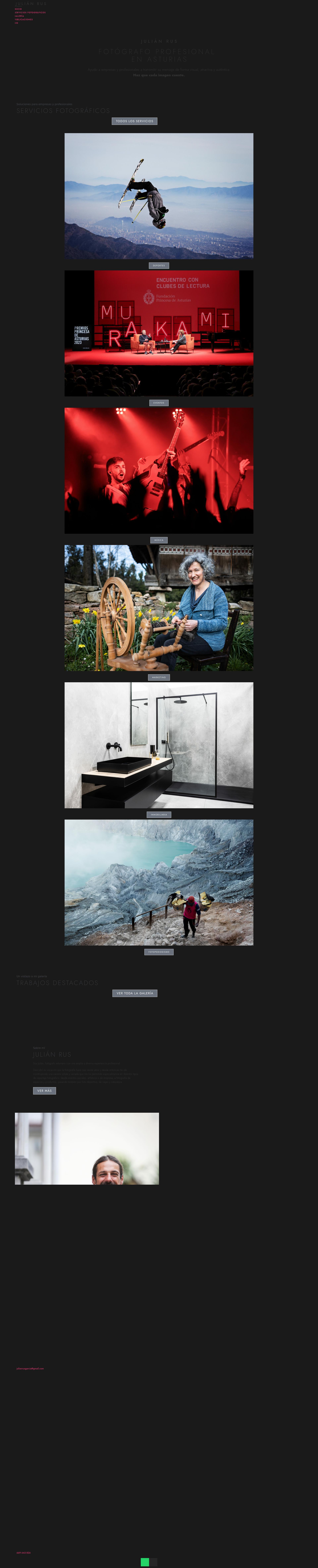 En Julián Rus Fotografía, ofrezco una amplia gama de servicios adaptados a las necesidades de cada cliente. Desde fotografía de eventos, deportes, inmobiliaria y marketing, hasta proyectos de fotoperiodismo y música. Todas mis imágenes están diseñadas para transmitir autenticidad y destacar cada detalle.