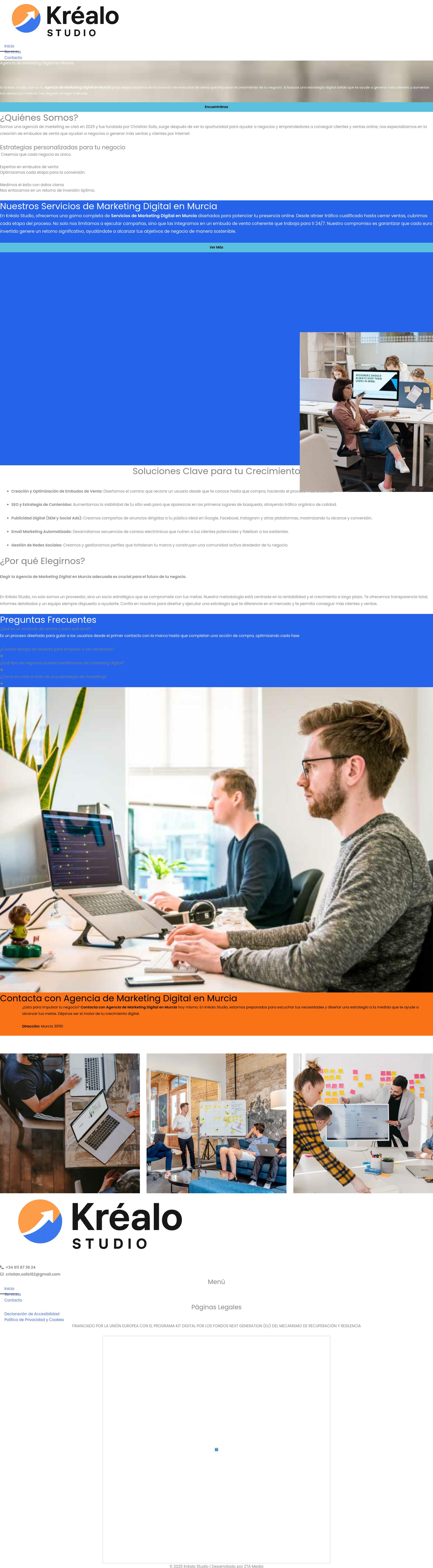 En Kréalo Studio, somos tu Agencia de Marketing Digital en Murcia y nos especializamos en la creación de embudos de venta que impulsan el crecimiento de tu negocio. Si buscas una estrategia digital sólida que te ayude a generar más clientes y aumentar tus ventas por internet, has llegado al lugar indicado.