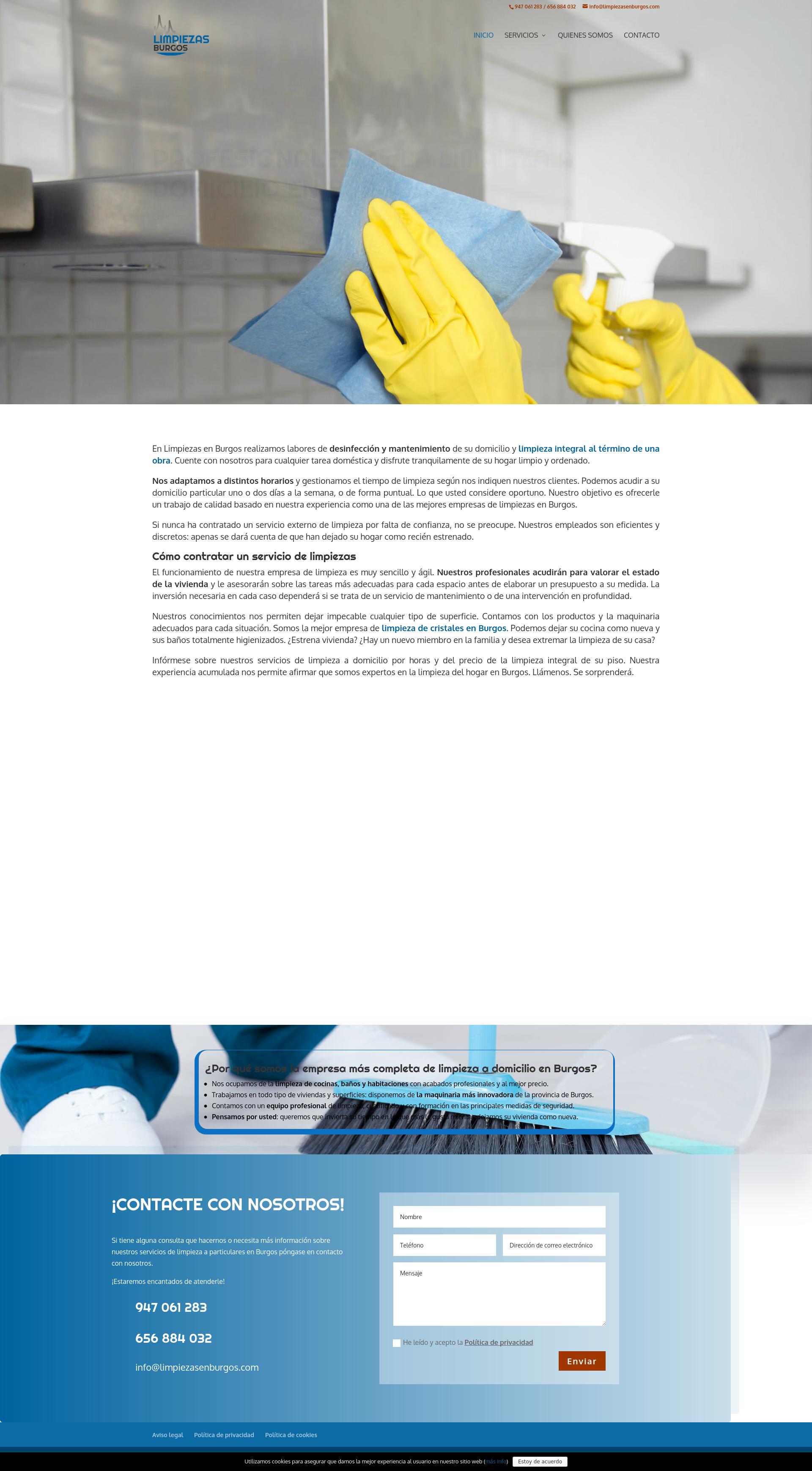 Limpiezas en Burgos es una empresa de servicios de limpieza a domicilio que cuenta con un equipo de profesionales cualificados para cualquier tarea. Ofrecemos servicios puntuales de limpieza integral o de limpieza de fin de obra. También hacemos trabajos regulares por horas en viviendas de todo tipo. Infórmese de nuestras tarifas de limpieza de cristales y de cocinas y baños.