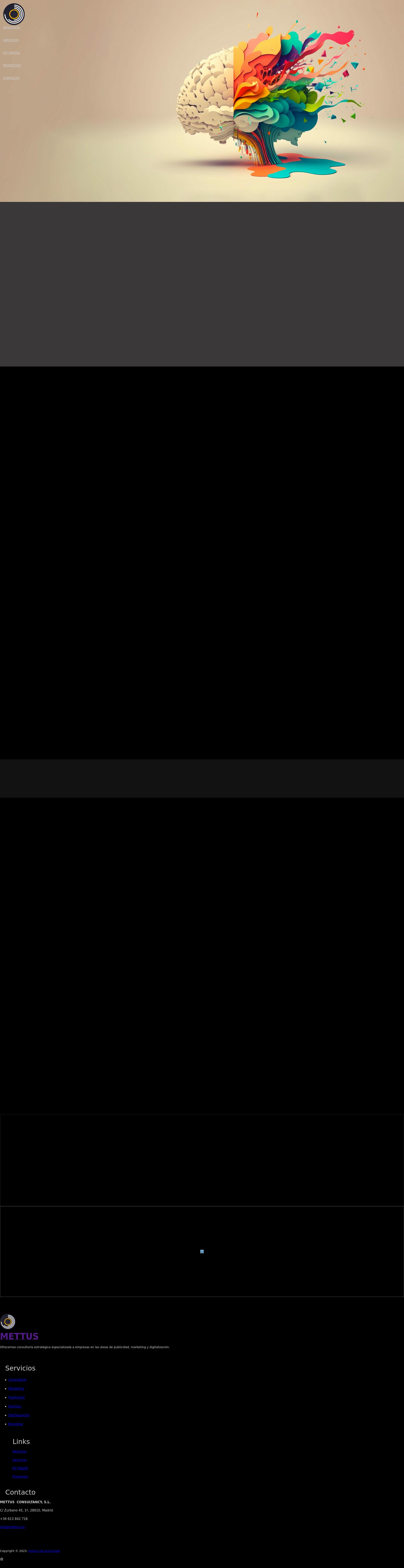 Mettus es una consultora especializada en publicidad, marketing y transformación digital. Ayudamos a las empresas a mejorar su visibilidad, conectar con su público y crecer de forma sostenible. Combinamos estrategia, creatividad e innovación tecnológica para diseñar soluciones a medida que generan resultados reales.