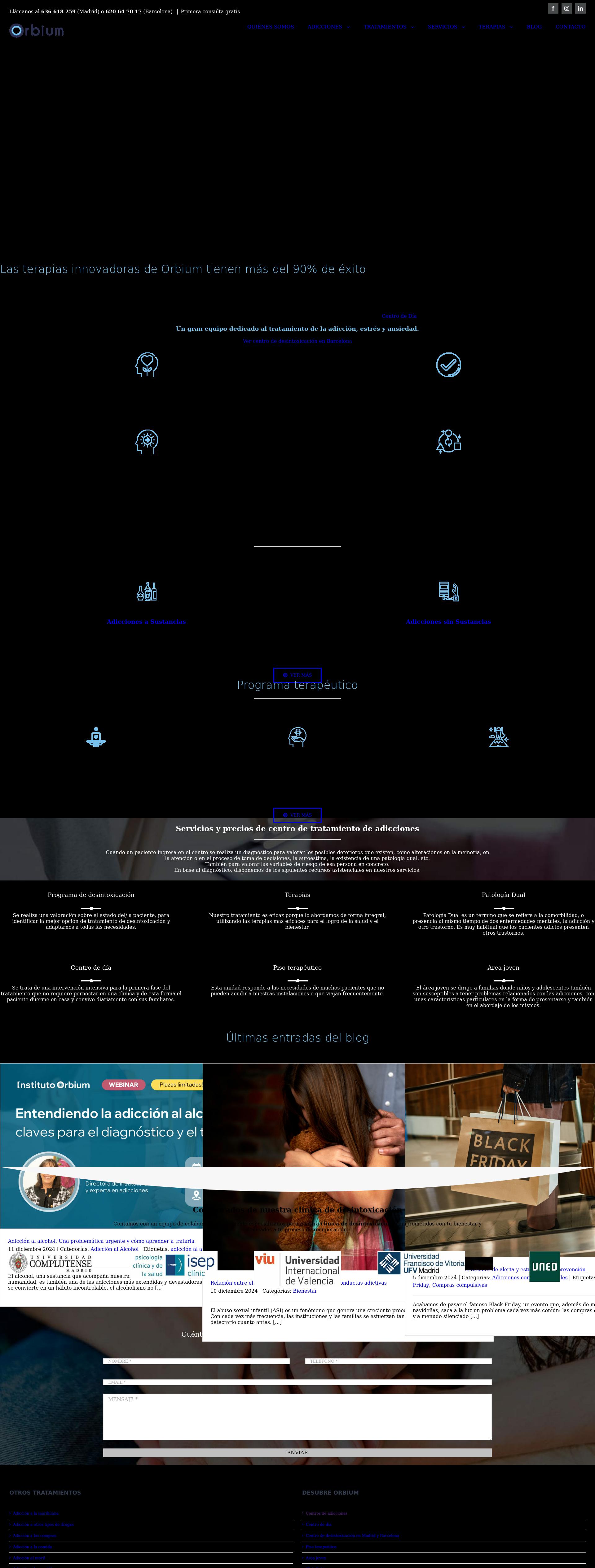 Centro especializado en tratamiento de adicciones, estrés y ansiedad en Madrid. Aplicamos terapias de tercera generación, abordaje emocional y EMDR para una recuperación integral. Nuestro equipo experto ofrece servicios ambulatorios de alta calidad, logrando que más del 90% de pacientes mantengan la abstinencia y desarrollen una vida plena. Nos enfocamos en la recuperación sin sustitutos, promoviendo proyectos de futuro y una nueva vida para nuestros pacientes. En Orbium Desarrollo, nos enorgullece ver a nuestros pacientes emprender con éxito una vida renovada y feliz.