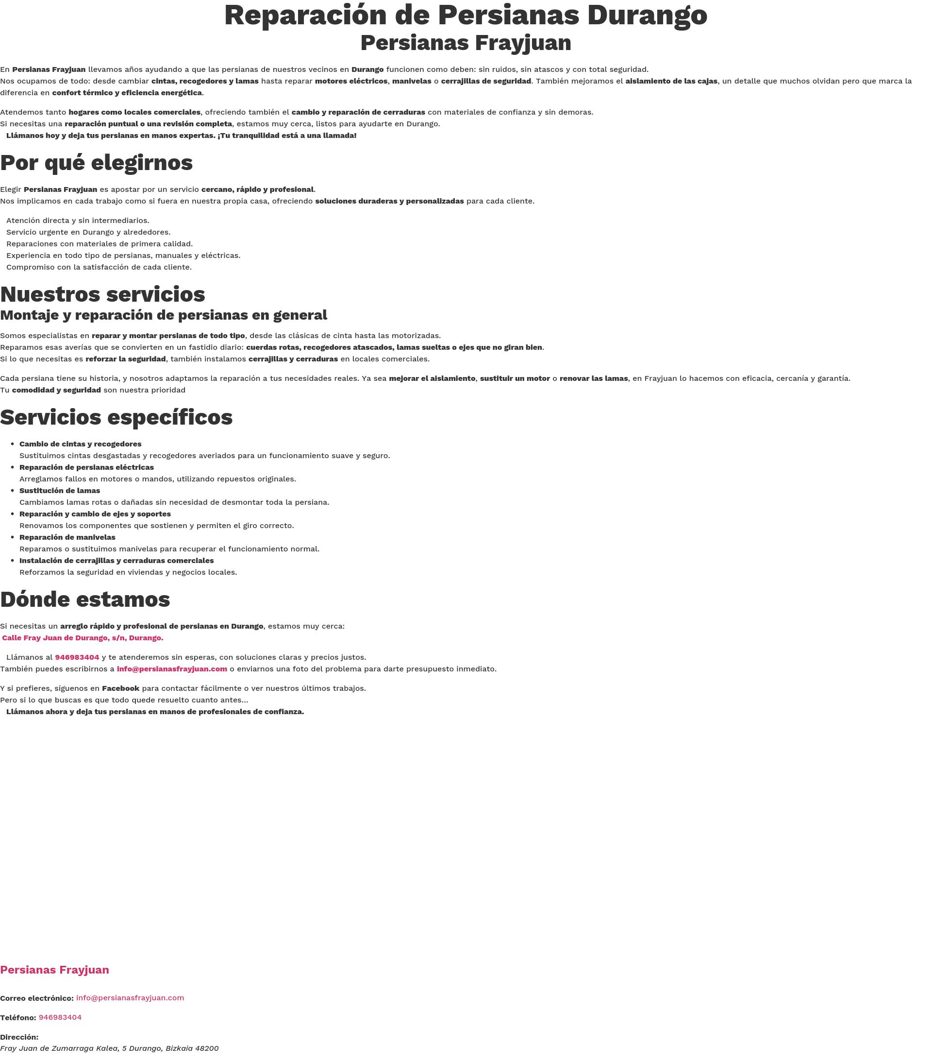 En Persianas Frayjuan somos la empresa de referencia en reparación y mantenimiento de persianas en Durango. Nos avalan años de experiencia y cientos de clientes satisfechos que confían en nosotros por nuestra profesionalidad, rapidez y calidad de servicio. Reparamos cintas, lamas, motores eléctricos, ejes, manivelas y recogedores, y mejoramos el aislamiento de las cajas para ofrecerte mayor confort y eficiencia energética. Además, reforzamos la seguridad de tu vivienda o negocio con cerrajillas y cerraduras resistentes. Nuestra atención es directa, sin intermediarios, con precios justos y resultados garantizados. Nos comprometemos a ofrecer soluciones rápidas y duraderas, porque tu comodidad y tu tranquilidad son nuestra prioridad. Estamos en Durango y trabajamos en toda la zona. Llámanos o envíanos una foto: te daremos presupuesto al momento